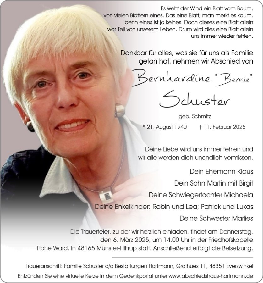 Bernhardine "Bernie" Schustergestorben am 11. Februar 2025