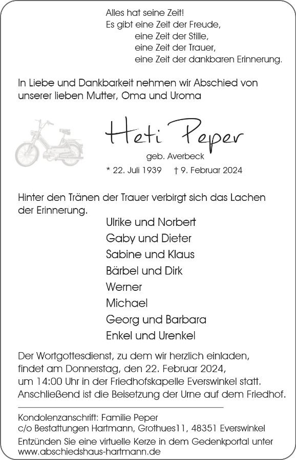 Liebe Familie Peper, meine herzliche Anteilnahme zum Tode Ihrer lieben Mutter, Schwiegermutter und Oma Heti.