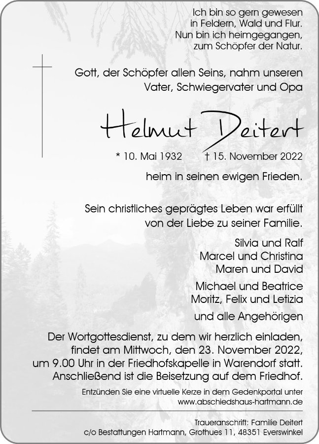 „Er ist so gern gewesen in Feldern, Wald und Flur. Nun ist er heimgegangen zum Schöpfer der Natur“