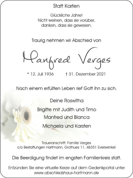 Ich habe dich immer für dein Lebenswerk bewundert. Du hast so hart gearbeitet und auf so vieles verzichtet, um uns ein tolles Heim zu verschaffen und dass ist dir auch gelungen. Dabei hast du dir immer Zeit genommen, um uns eine glückliche Kindheit zu bescheren. Auch nach unser Kindheit warst du immer für uns da. Du hast mich zu dem Menschen geformt, der ich heute bin. Dafür bin ich die unendlich dankbar. Ich hatte den besten Vater der Welt. Ich kann gar nicht glauben, dass du nicht mehr da bist. Ich vermisse dich. Danke, dass es dich gab.