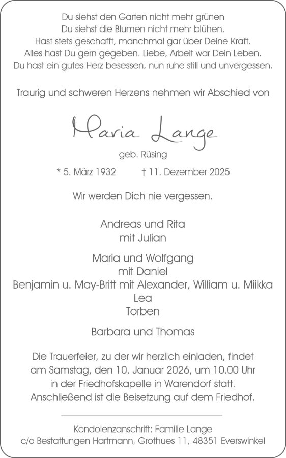 Trauerfeier mit anschl. Beisetzung, Friedhofskapelle Warendorf